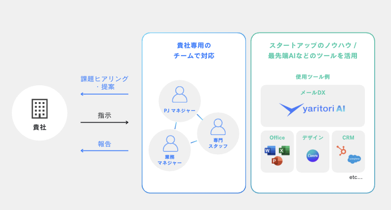 そこで当社は、AIエージェント「yaritori AI」を中核に据えた業務支援体制「yaritori アシスト」を新たに立ち上げました。AIと人のハイブリッドによる高品質な業務遂行を実現し、企業の成長を支援してまいります。