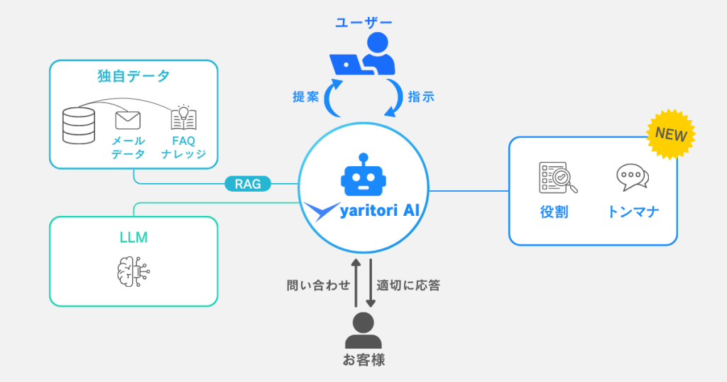 『yaritori AI』は、LLMと独自データ(過去の対応履歴やFAQ・ナレッジ)を活用し、適切な回答文を瞬時に生成するAIエージェントです。