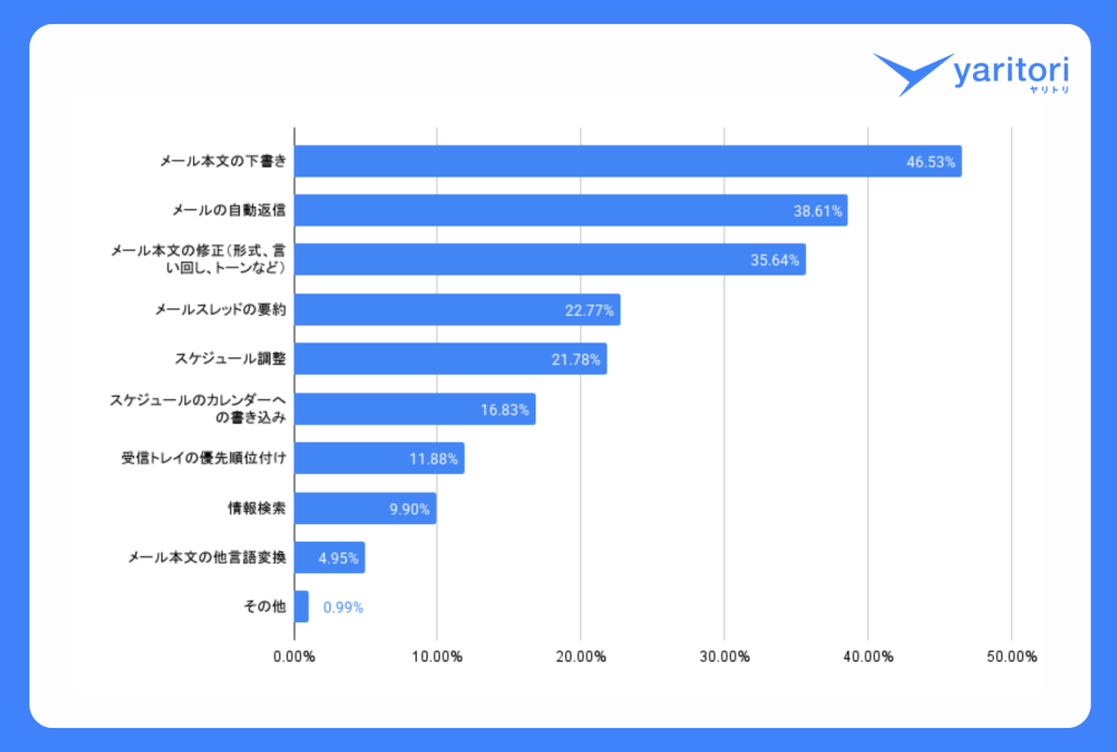 具体的なAIの活用用途は、「メール本文の下書き」「メールの自動返信」「メール本文の修正」が上位を占めています。メール対応に必要な一連のタスクのなかで、とくに多くの時間を使う「メール本文の作成」についてAI活用が進んでいることがわかります。