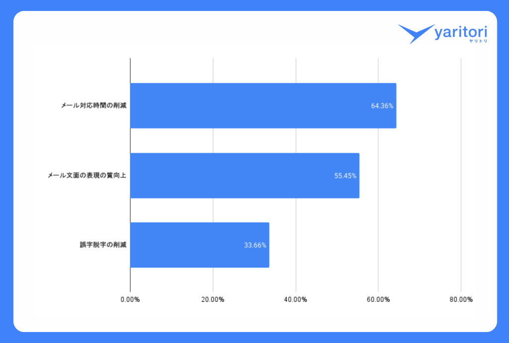 一方で、AIを活用している人からは「対応時間の削減」や「文面品質の向上」といった効果が多く報告されています。メール業務におけるAIの実践活用が、今後の働き方の効率化や質の向上を支える鍵となるでしょう。
